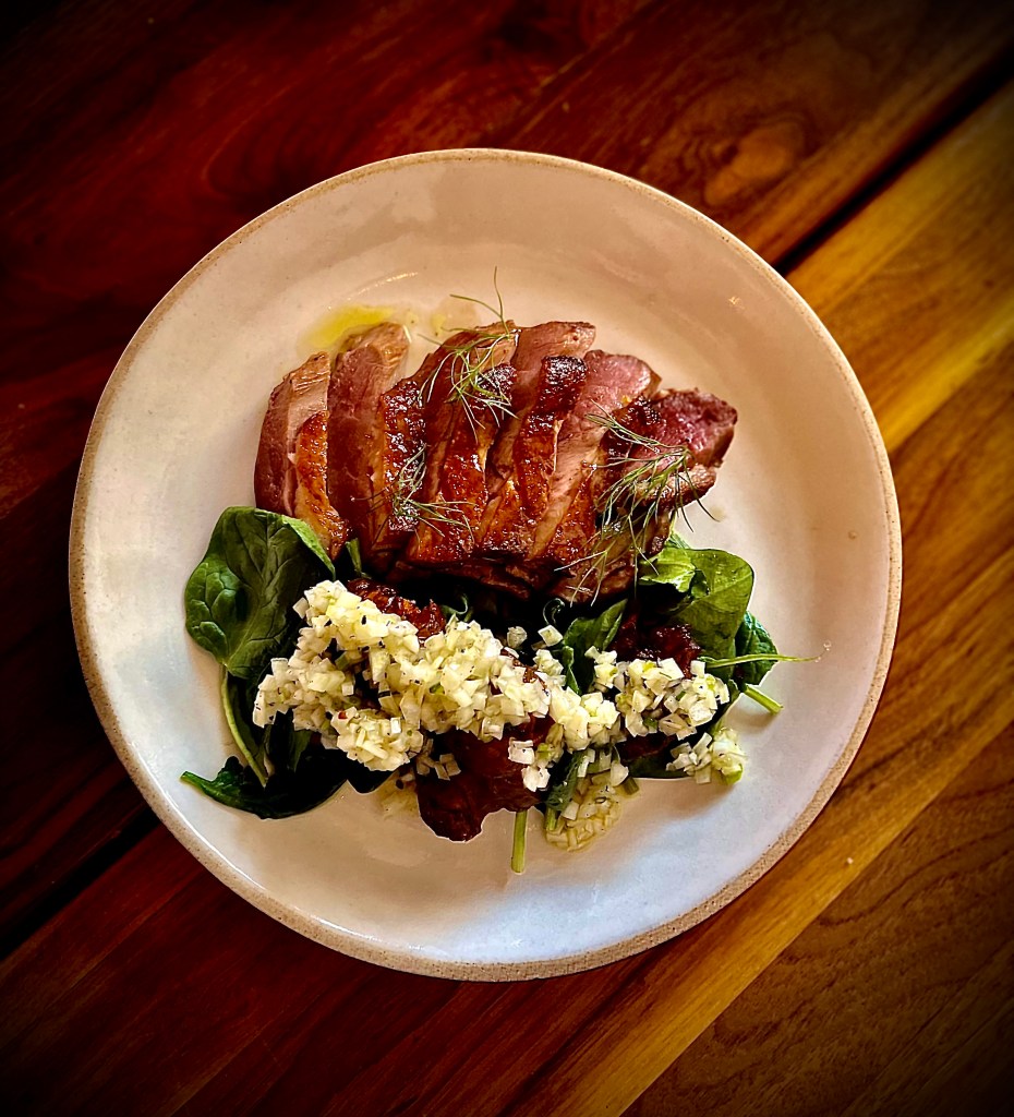 Seventh Dish: Seared Duck Breast, fried sunchokes, local spinach, ravigote, umeboshi plum jus.