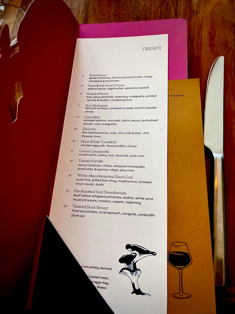 Mushrooms, fish, and rice: one of my absolute favorite combinations. This dish’s rice did not give me sushi rice bibs but leaned a tad more toward a congee with the wetness. Which did it some good. The grilled bok choy added a pleasant cabbage-like flavor and did not overpower. Now the smoked trout caviar was the perfect addition to the light, perfectly flaky cod. This dish was well thought out and distributed.