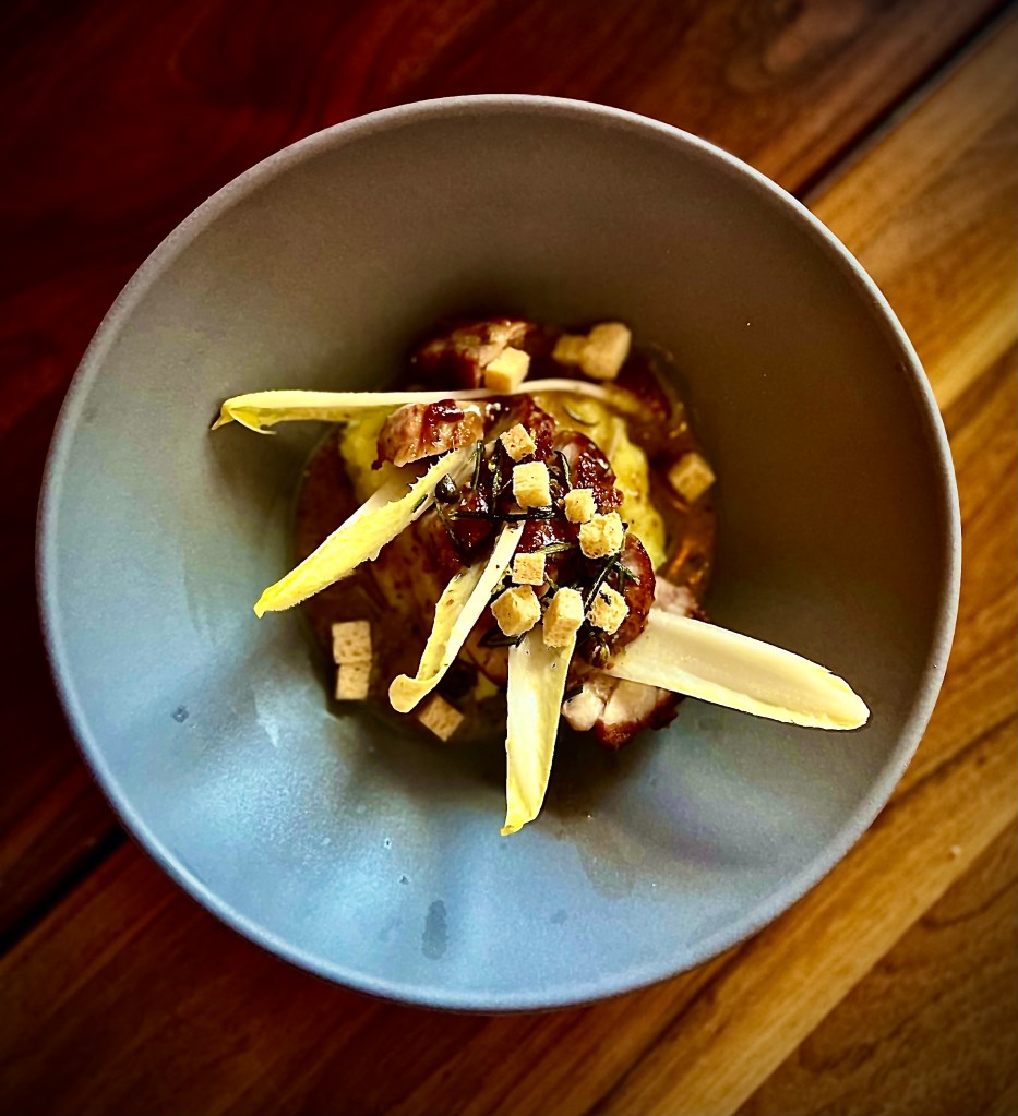 Sixth Dish: Pan Roasted Veal Sweetbreads, beef tallow whipped potatoes, endive, white wine mustard sauce, crouton, capers,rosemary.