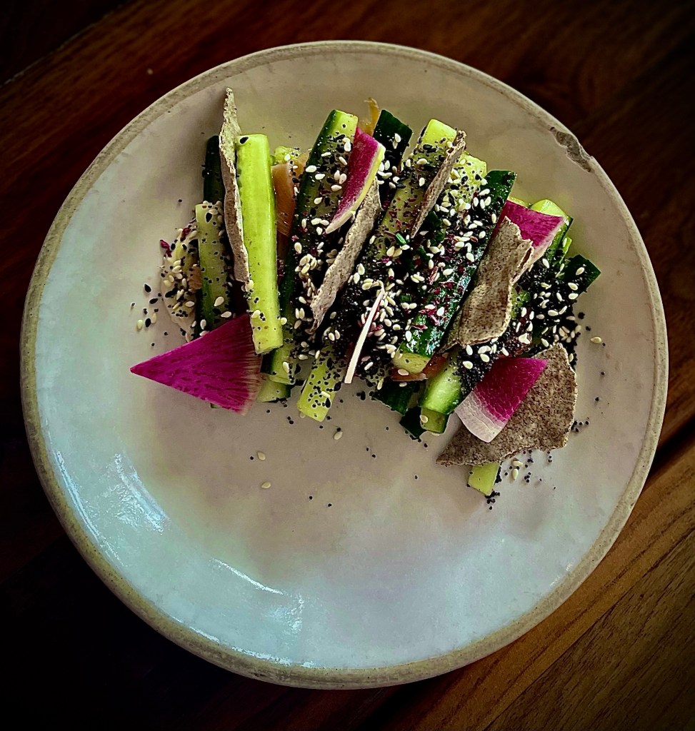 First Dish: Cucumber, smoked salmon, avocado, tahini sauce, buckwheat lavosh, rose vinaigrette.